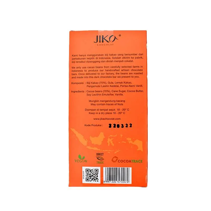Jika chocolate only use the best Indonesian cacao beans sourced directly from the farmers to produce our small batch handcrafted chocolate bar. Ingredients: Cocoa beans, Cane Sugar, Cocoa Butter, Soy Lecithin, Vanilla.