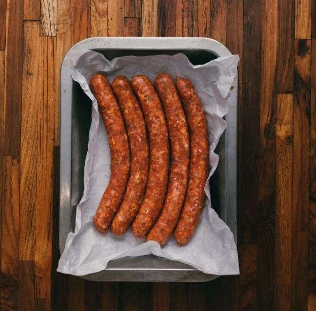 The lamb merguez is a Moroccan style sausage, nice and spicy and perfect for the BBQ.