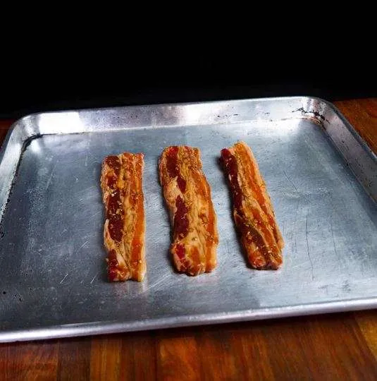 Sliced pork belly marinated with soy sauce, honey, ginger and garlic. Ready for lightly pan-frying or grilling over hot coals. 80g is roughly one piece