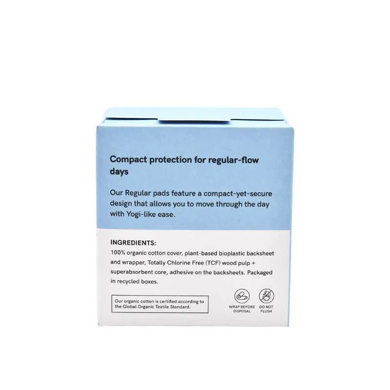 Ingredients:100% organic cotton cover, plant-based bioplastic backsheet and wrapper, Totally Chlorine Free (TCF) wood pulp and Japanese superabsorbent core, adhesive on the backsheets. Packaged in recycled boxes.
